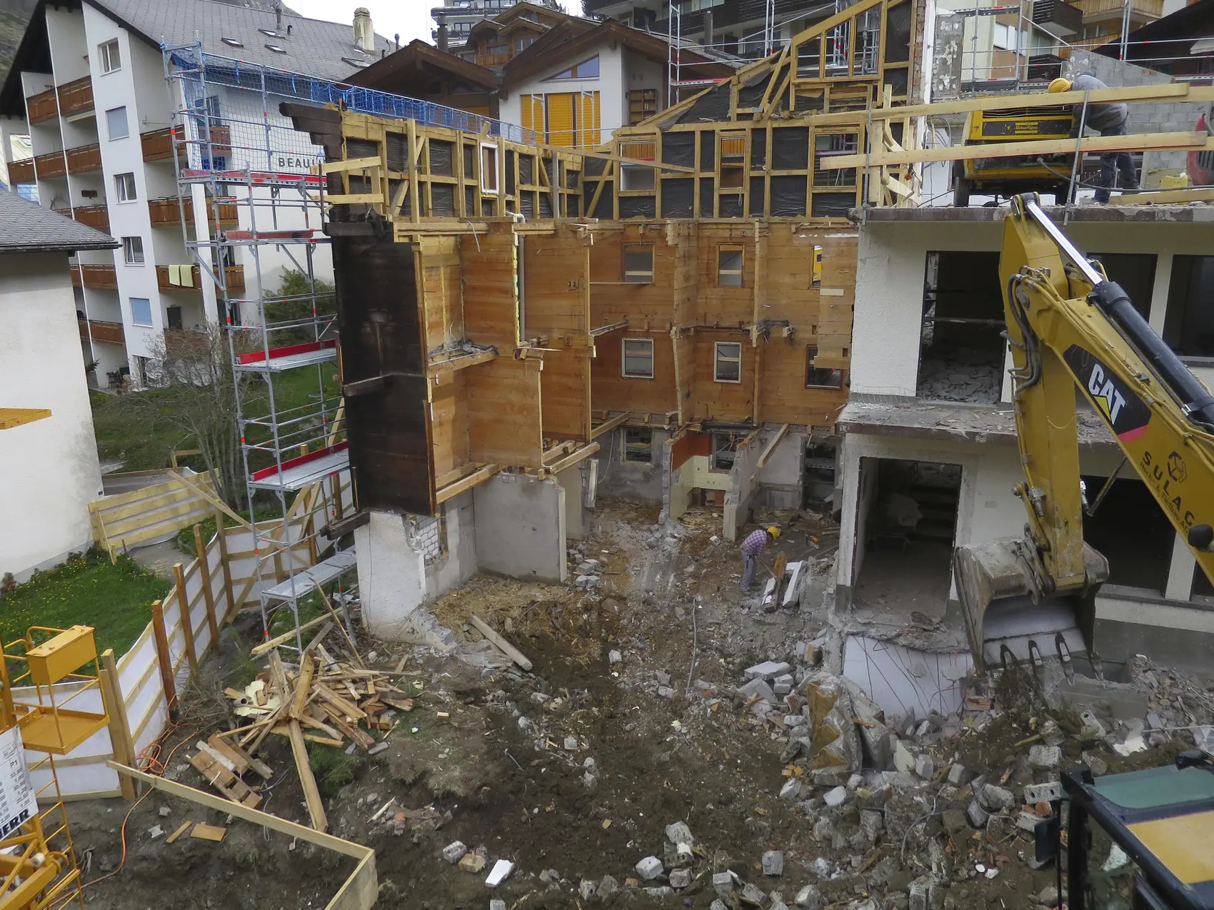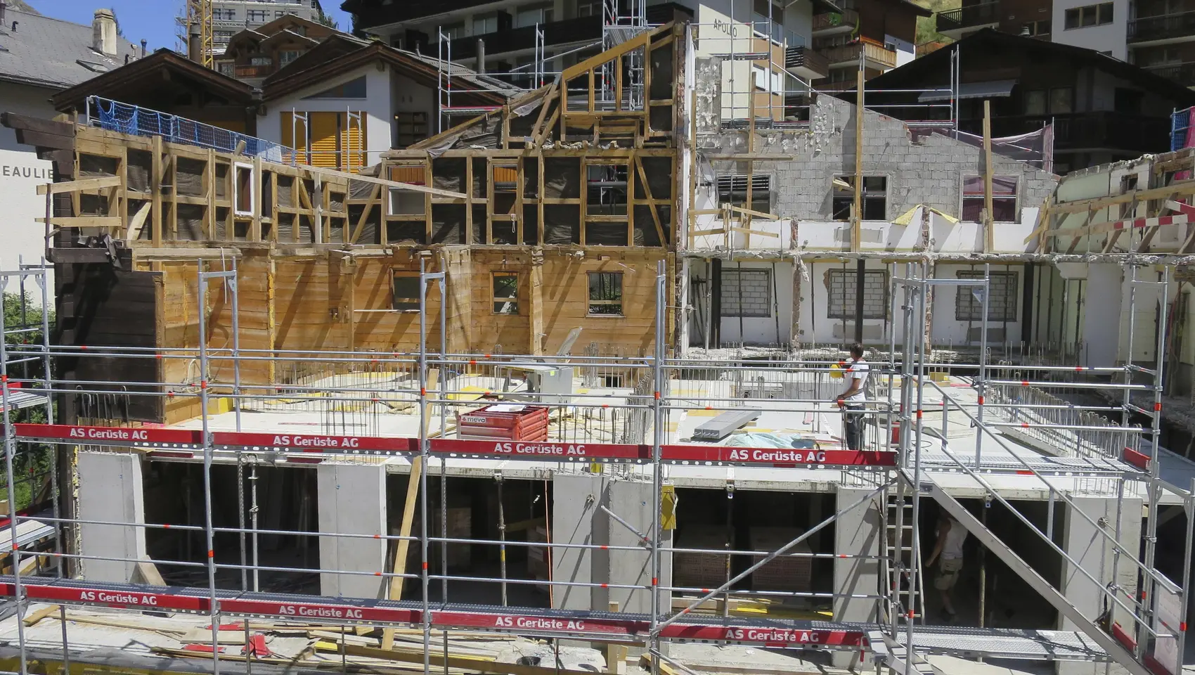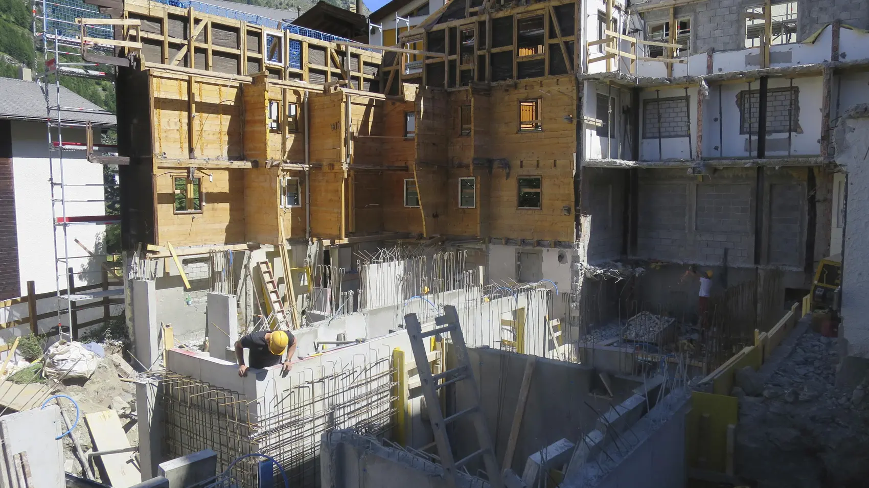 Objektbeschrieb | Um- und Ausbau des ehemaligen Hotel Blauherd.Das bestehende Gebäude wurde unter Beibehaltung der Ost- West- und Nordfassade abgebrochen.Diese Wände wurden mit Hilfe einer Stahlkonstruktion ausgesteift und gesichert um anschliessend den Neubau zu errichten. -Offene Baugrube, frei geböscht -Unterfangungen bestehende Fassadenwände -Flachfundation auf Lockergestein -Tragwerk des Neubaus in Ortbeton oder Mauerwerk -Dachkonstruktion in Hol |