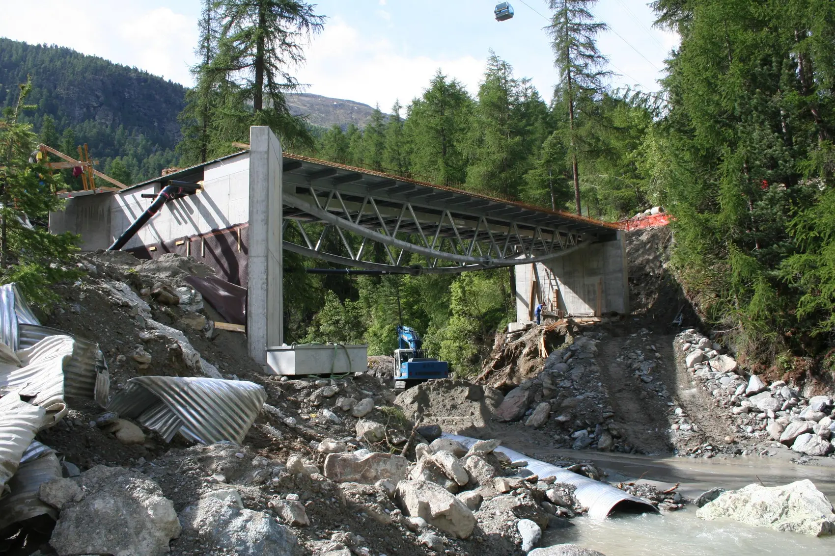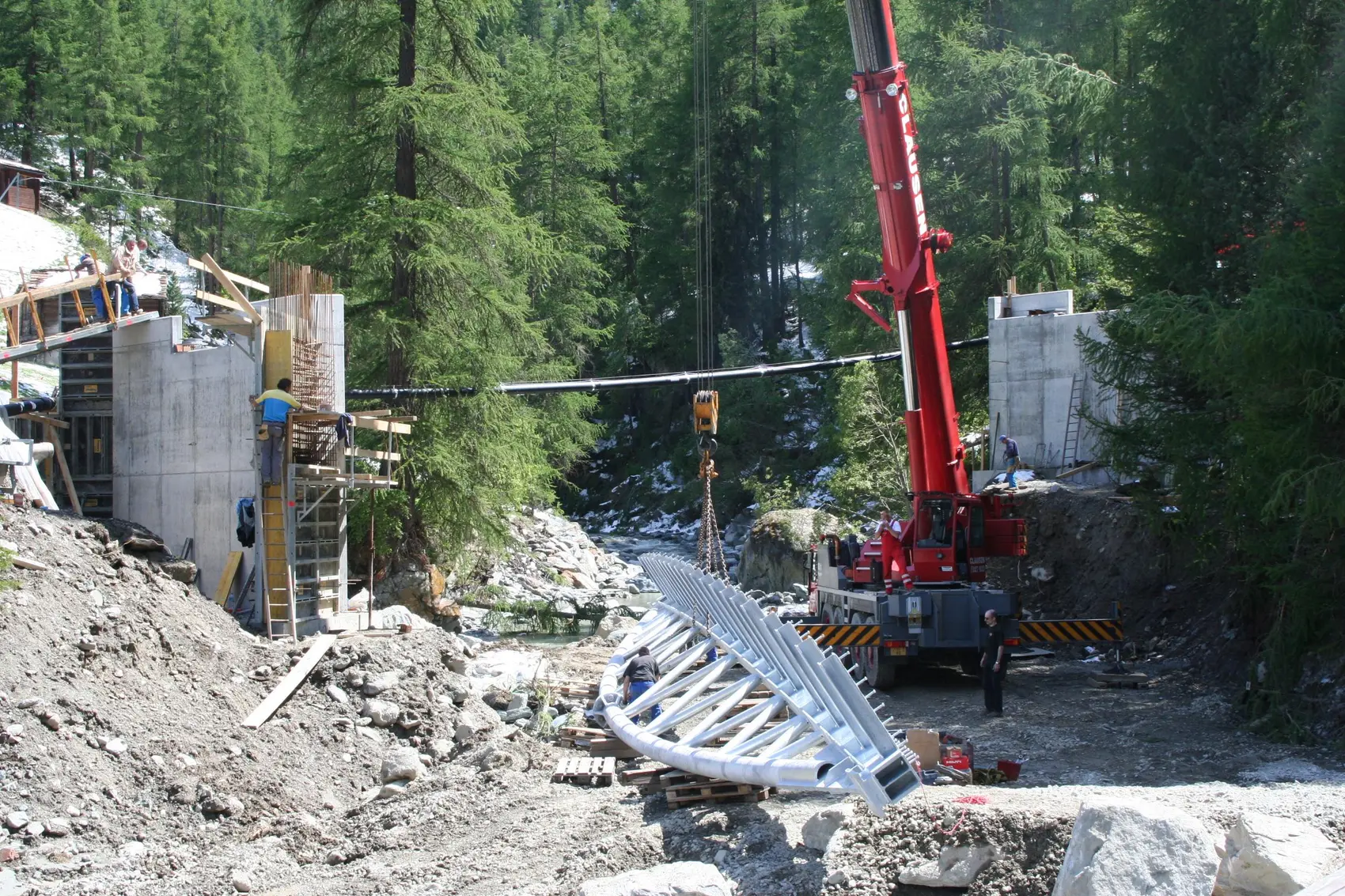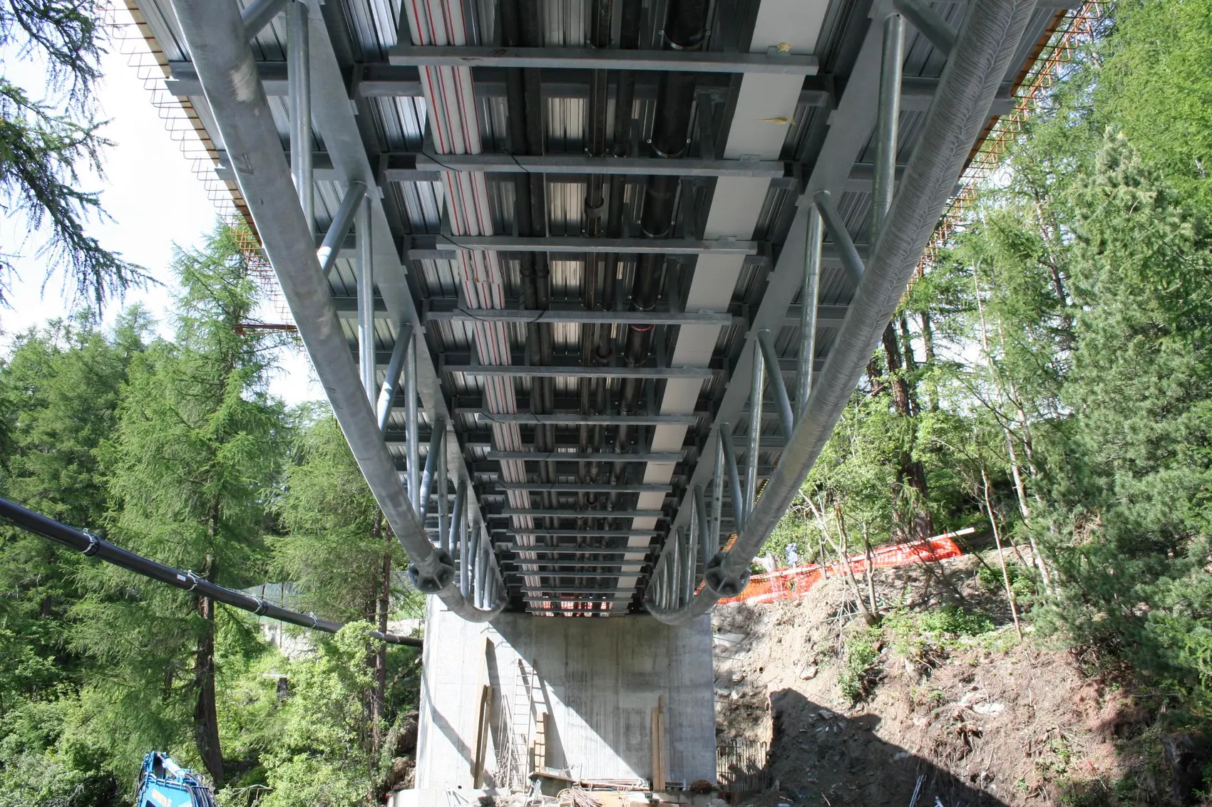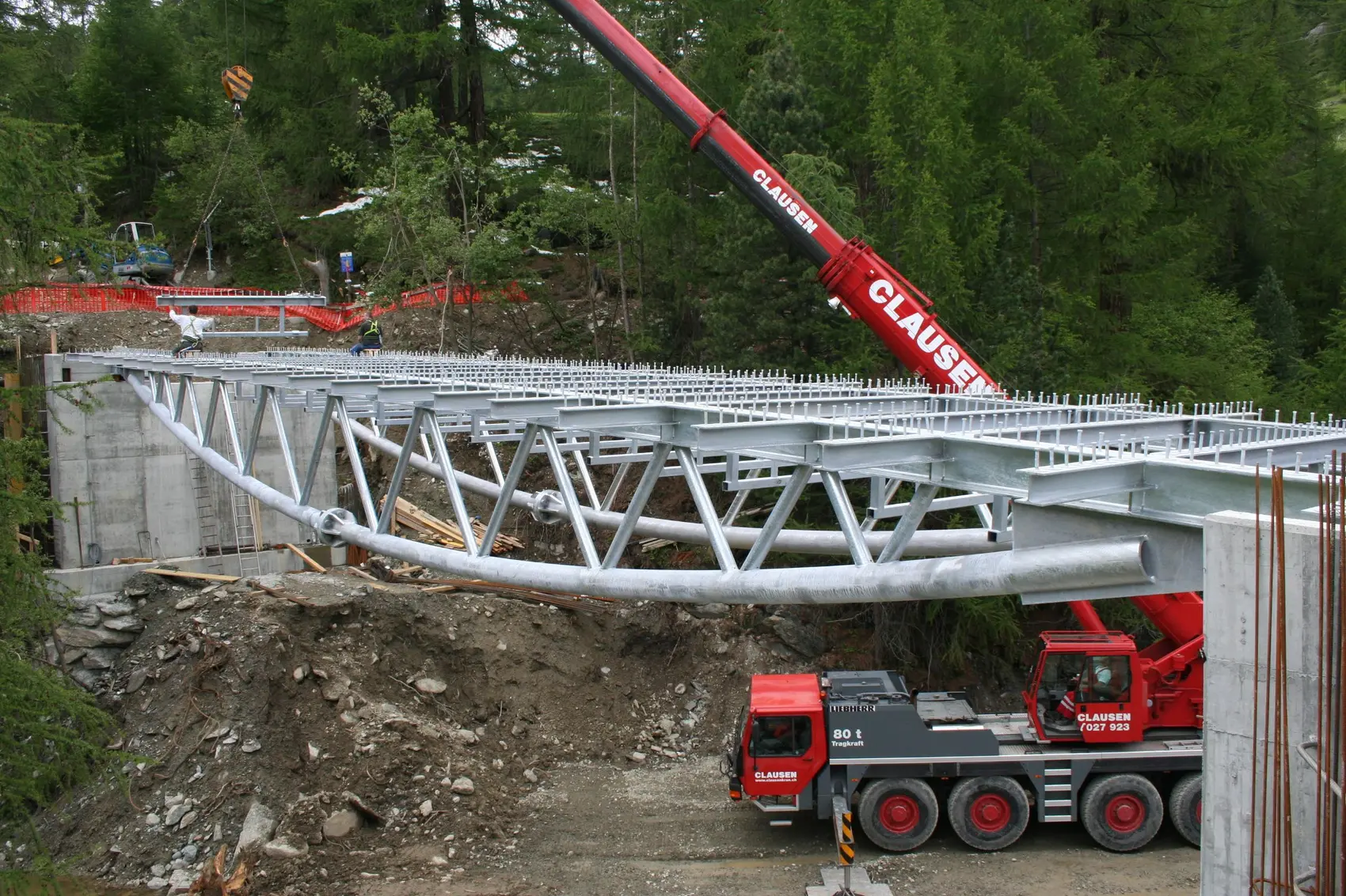 Objektbeschrieb | Die Hauptkonstruktion der Brücke besteht aus 2, der Momentenlinie angeglichenen, gebogenen Stahlfachwerken. Um auf ein Lehrgerüst zu verzichten, wurde die Fahrbahnplatte über Querträger als Stahl-Beton- Verbundkonstruktion ausgebildet. Die Brücke ist bei beiden Widerlagern auf je 2 Topflager gerlagert. Brückenlänge: 30.0m Fahrbahnbreite: 6.50m Längsgefälle: 8.6 % Konstruktion: Stahlfachwerk mit ROR-Profilen (Höhe 2.20m, Länge 30m) Fahrbahnplatte: Stahl-Beton-Verbund Geländer: Winter: System mit Fangnetzen / Sommer: Normales Geländer |